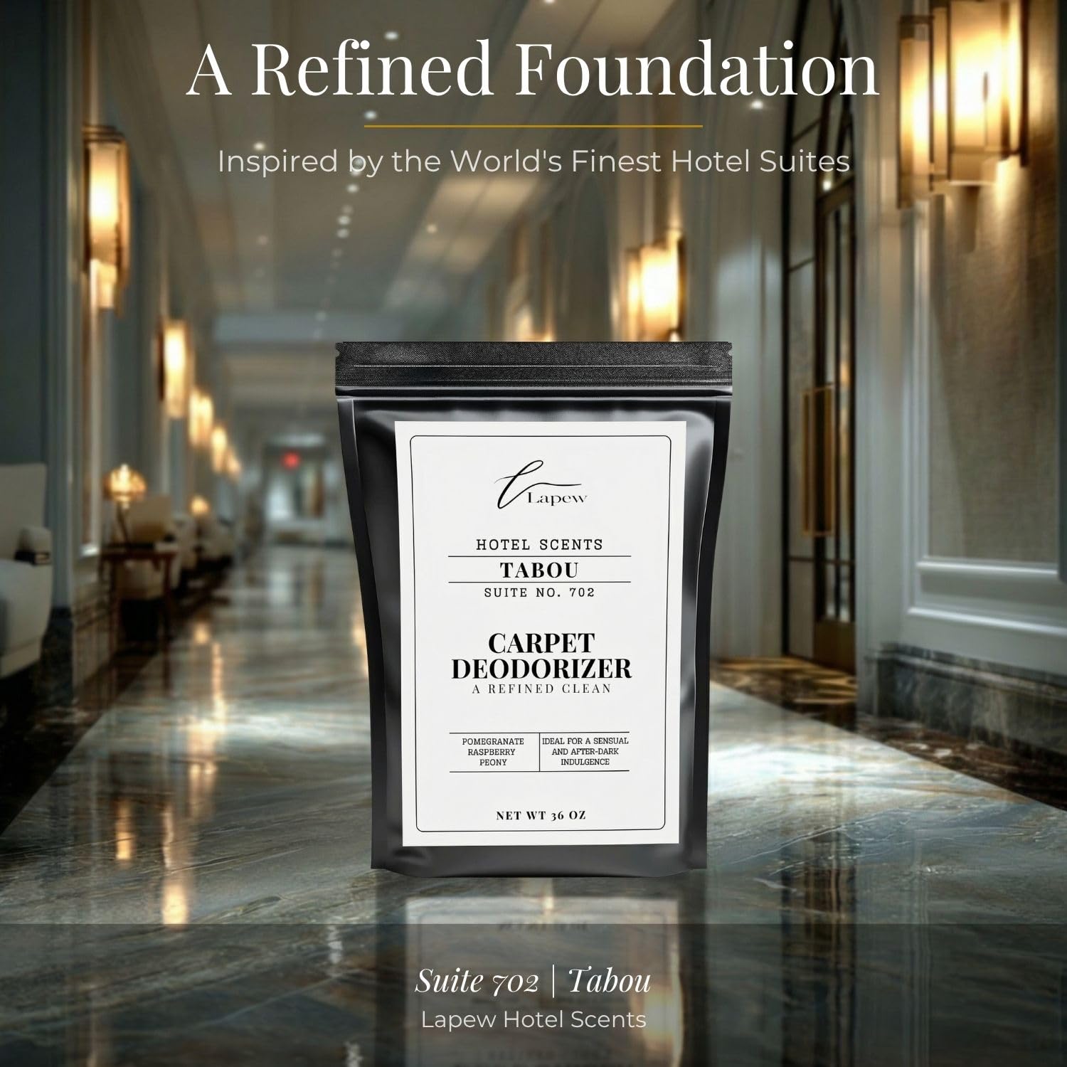 - Step 2 of 4 in The Lapew Home Scent Ritual — after Step 1 Mop Soap, sprinkle this carpet deodorizer powder generously over your carpets and rugs. Let sit for 10-15 minutes to absorb odors and release fragrance, then vacuum thoroughly. Follow with Step 3 Diffuser Oil and Step 4 Room & Linen Spray for the complete whole-home hotel experience.
