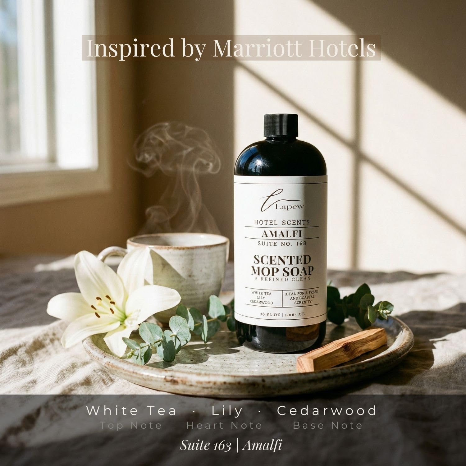 Breathe in the fresh coastal serenity of the Amalfi Coast with Amalfi Suite 163 — an elegant blend of white tea, lily, and cedarwood inspired by Marriott's most celebrated Mediterranean resort properties. Add to your mop water for a clean, coastal freshness throughout your home. Part of The Lapew Home Scent Ritual. Made in the USA.