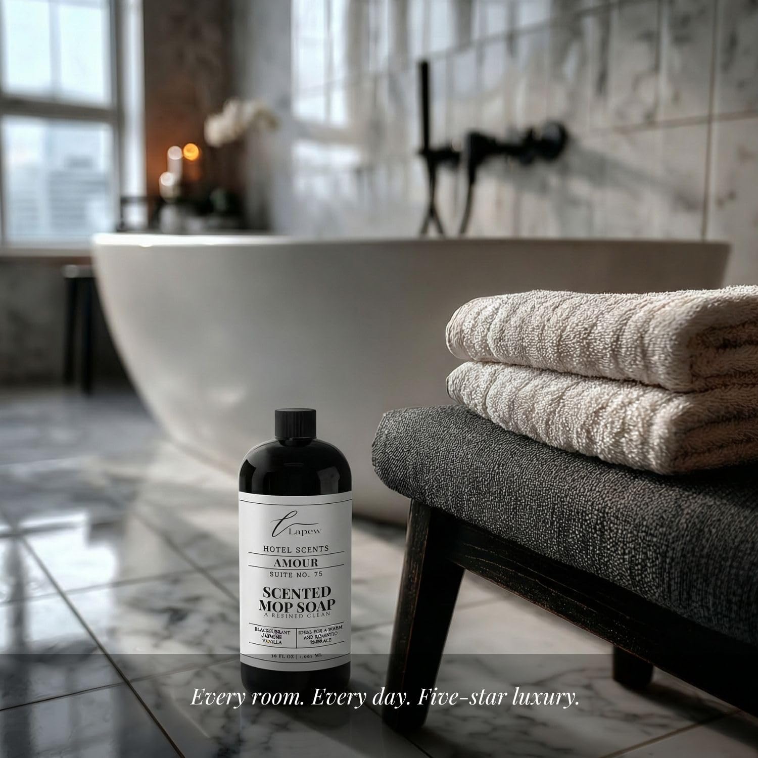 Step 1 of 4 in The Lapew Home Scent Ritual — start your whole-home scent experience with this luxury mop soap. Add ¼ cup per gallon of warm water and mop slowly, allowing the fragrance to bloom as floors dry. Follow with Step 2 Carpet Deodorizer, Step 3 Diffuser Oil, and Step 4 Room & Linen Spray for the complete five-star hotel experience.