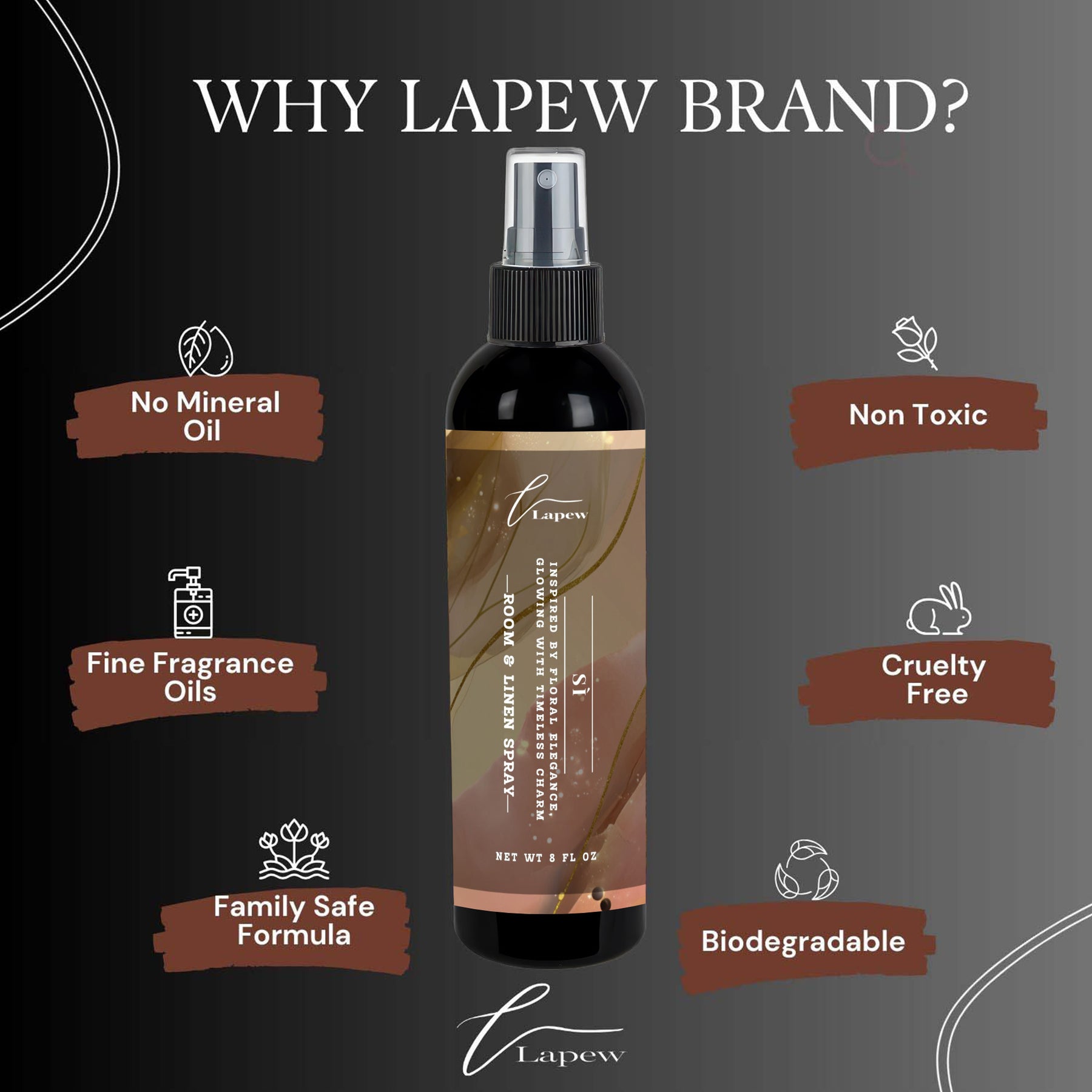 Elevated Home Fragrance: Lapew Sì, a refined room & linen spray and air freshener. Long-lasting, eliminates odors, freshens fabrics for an inviting home.