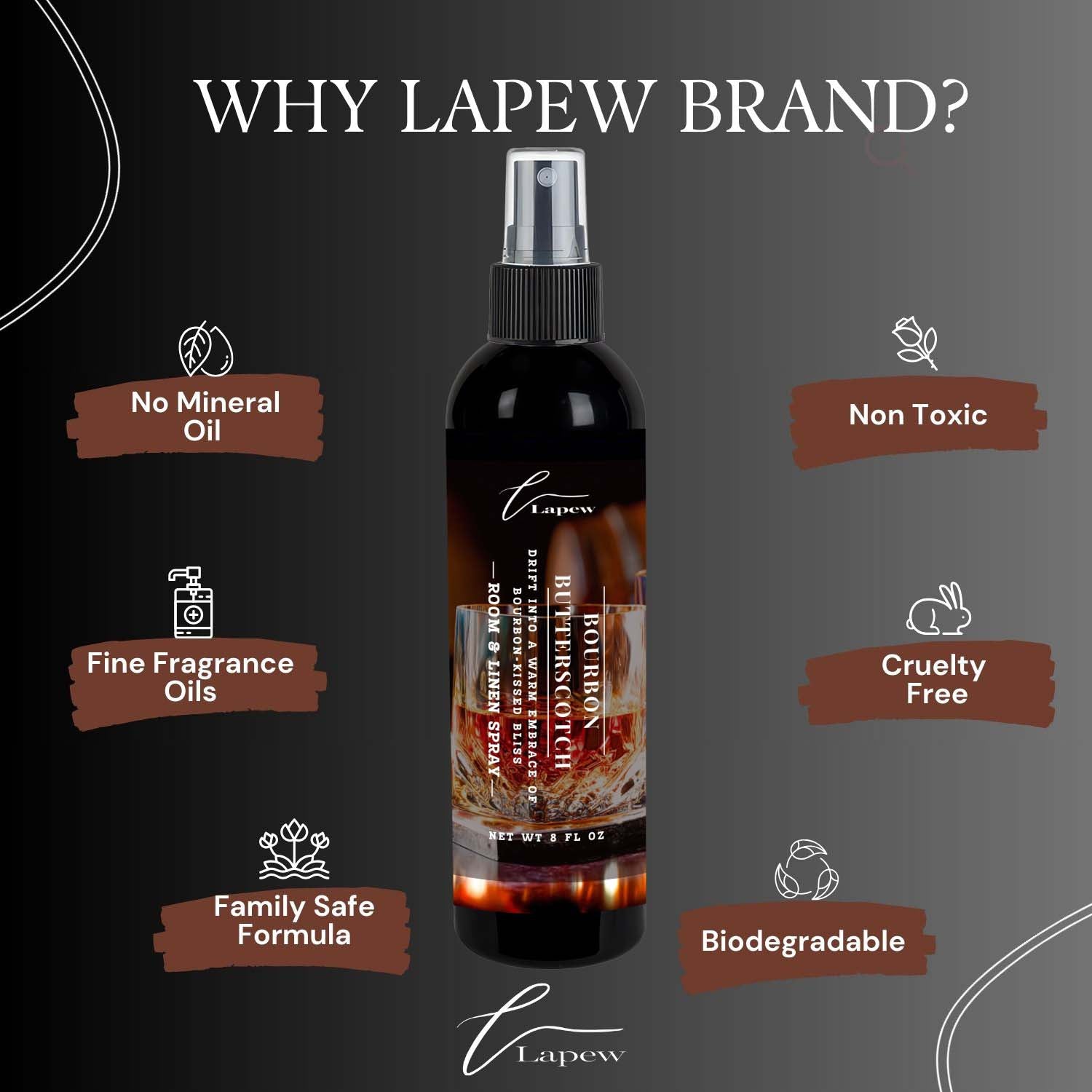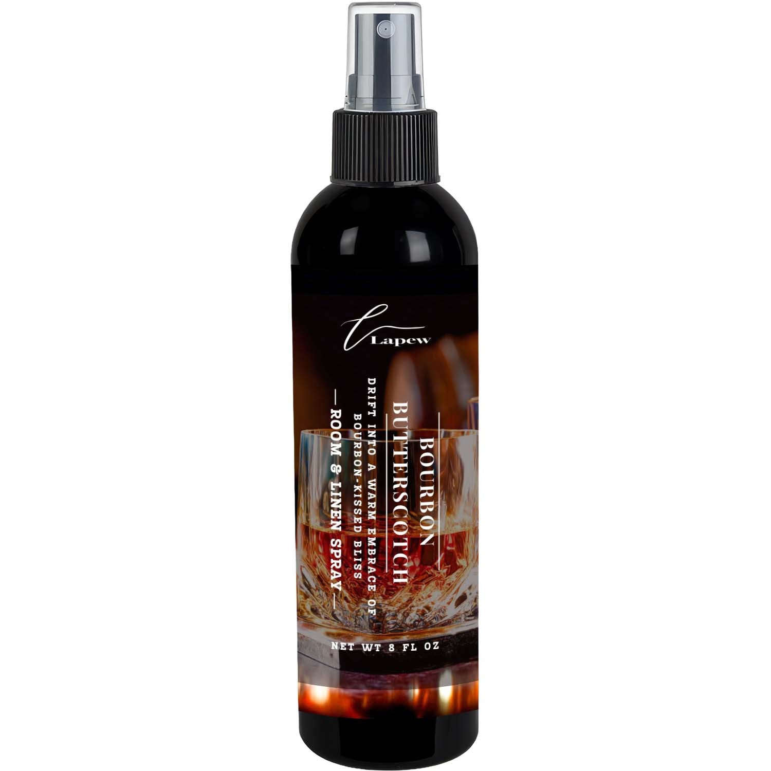 Elevated Home Fragrance: Lapew Bourbon Butterscotch, a refined room & linen spray and air freshener. Long-lasting, eliminates odors, freshens fabrics for an inviting home.