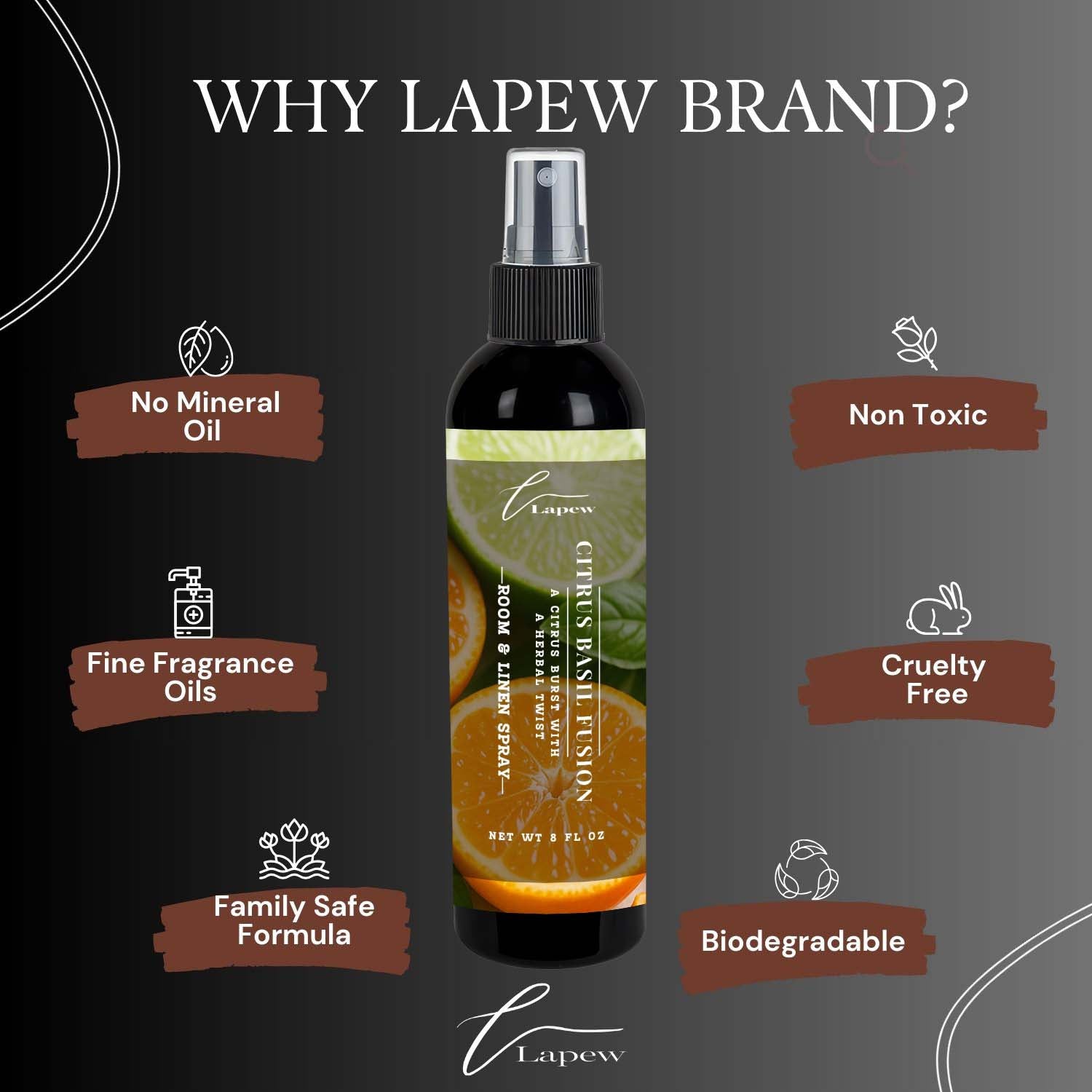 Elevated Home Fragrance: Lapew Citrus Basil Fusion, a refined room & linen spray and air freshener. Long-lasting, eliminates odors, freshens fabrics for an inviting home.