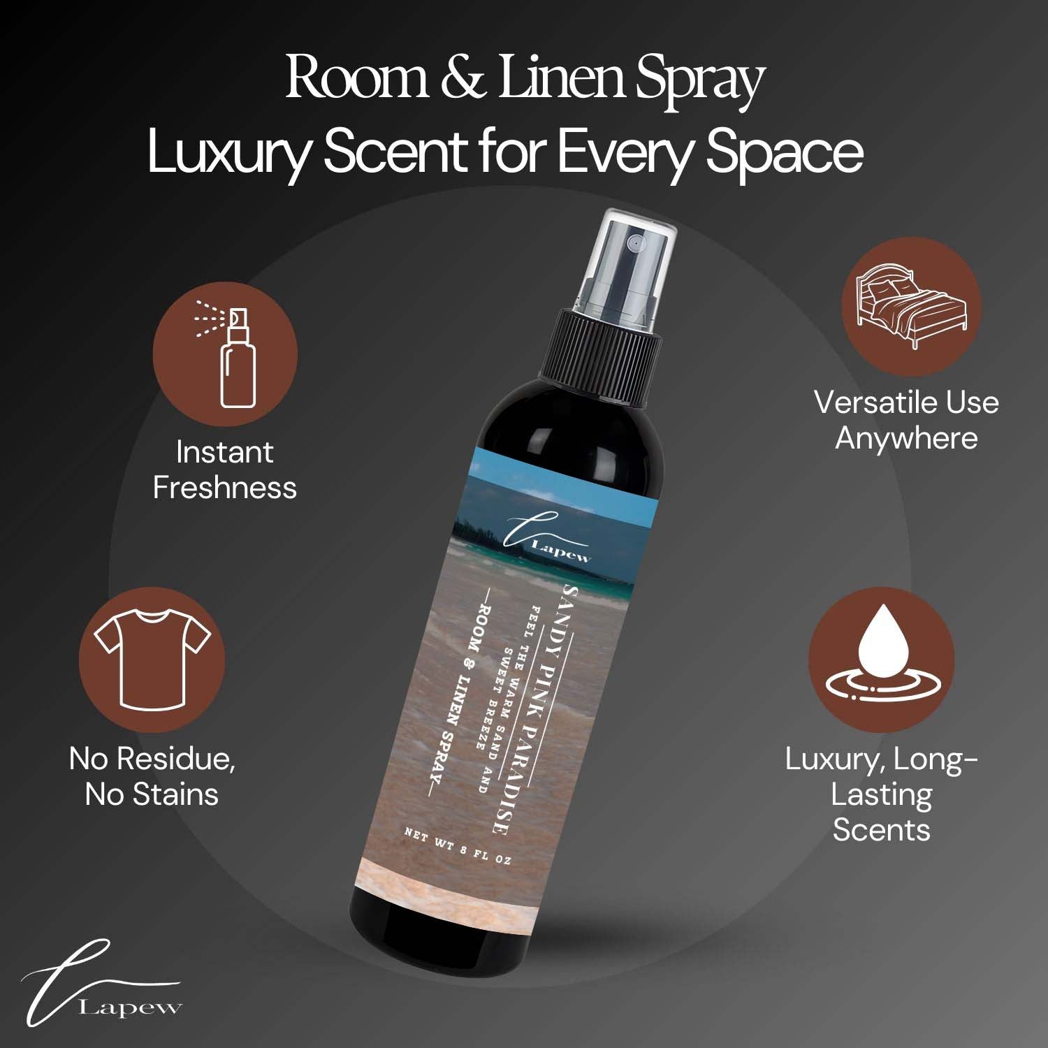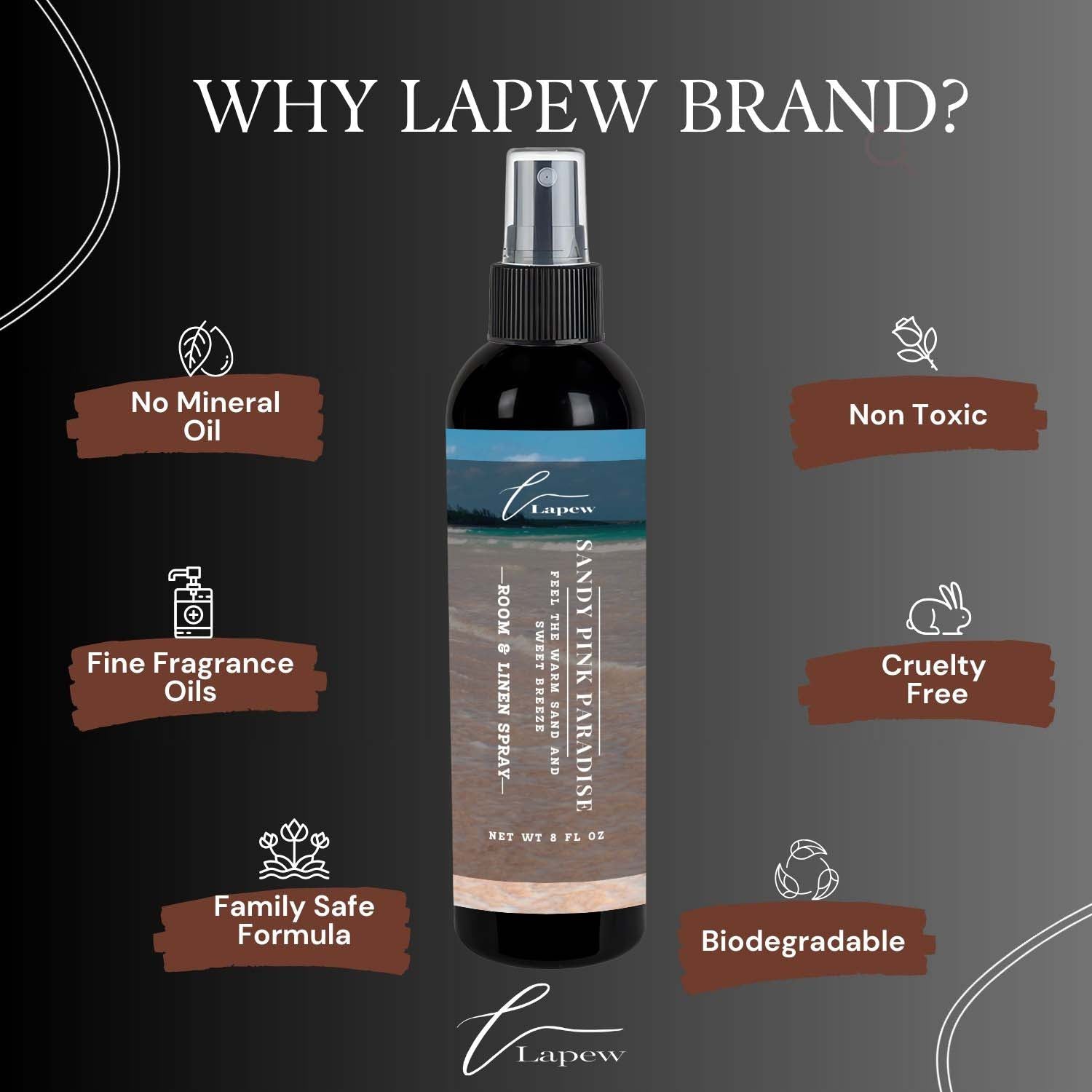 Elevated Home Fragrance: Lapew Sandy Pink Paradise, a refined room & linen spray and air freshener. Long-lasting, eliminates odors, freshens fabrics for an inviting home.