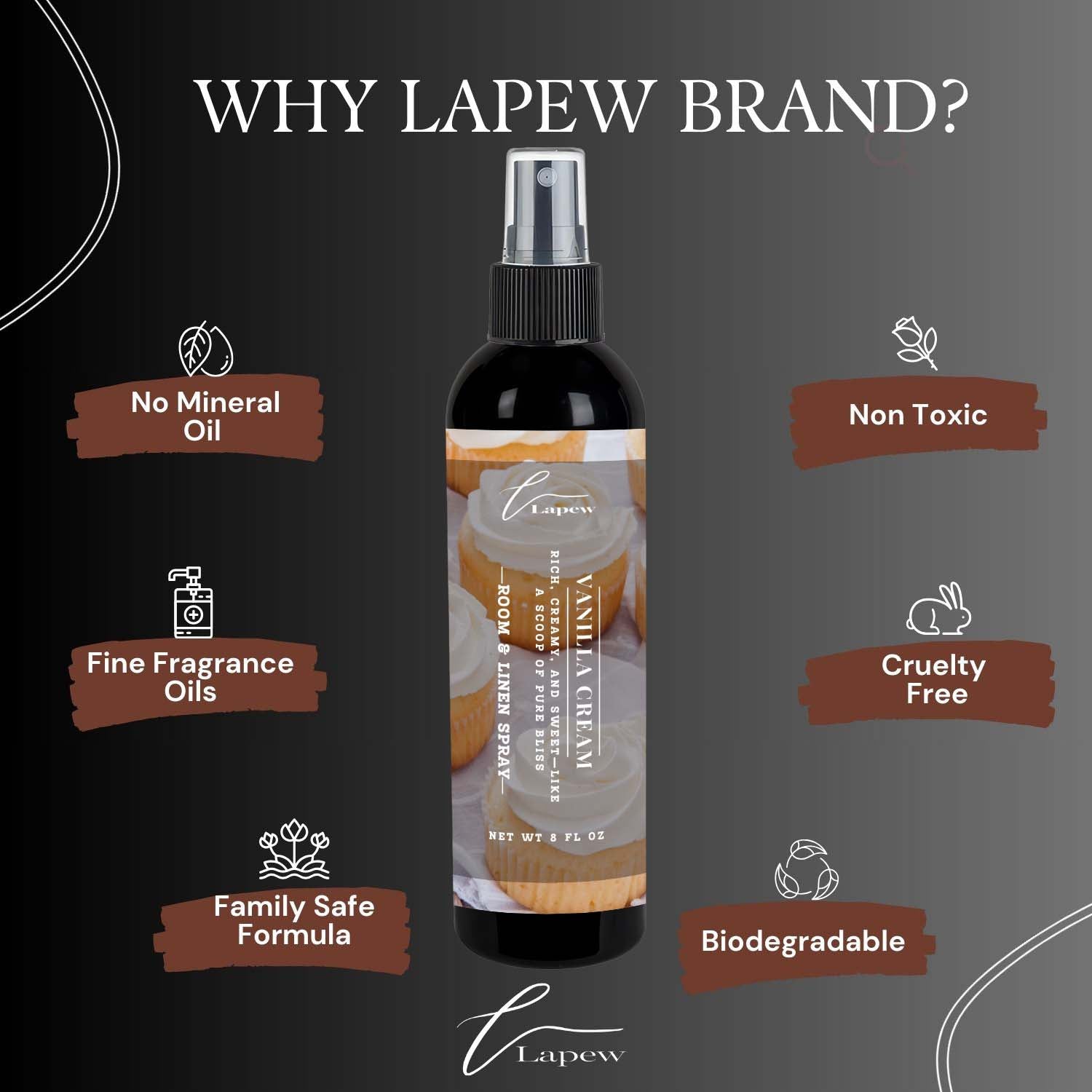 Elevated Home Fragrance: Lapew Vanilla Cream, a refined room & linen spray and air freshener. Long-lasting, eliminates odors, freshens fabrics for an inviting home.