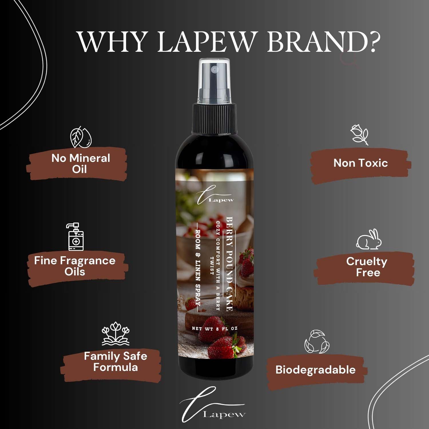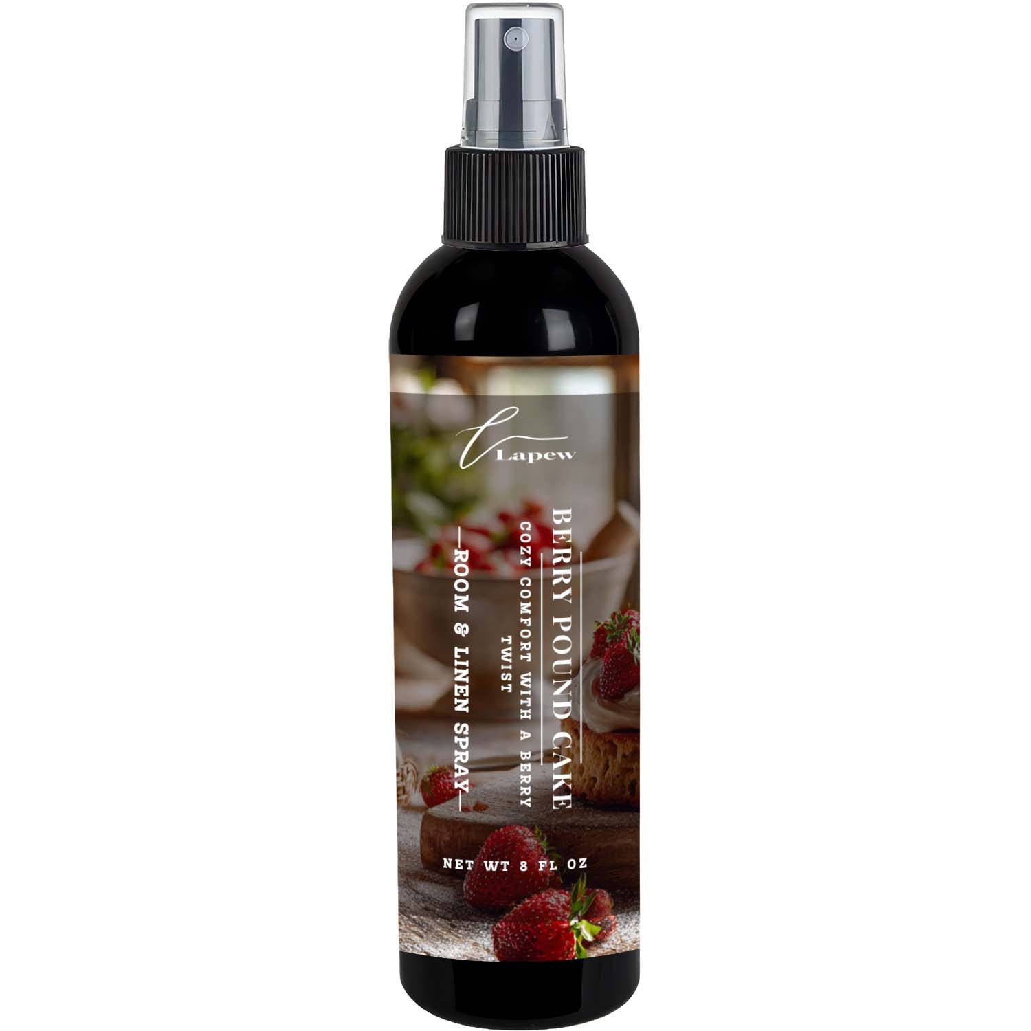 Elevated Home Fragrance: Lapew Berry Pound Cake, a refined room & linen spray and air freshener. Long-lasting, eliminates odors, freshens fabrics for an inviting home.