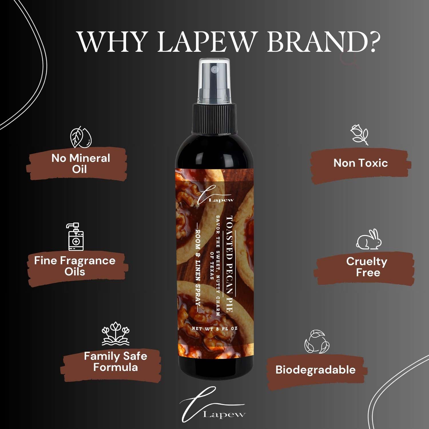 Elevated Home Fragrance: Lapew Toasted Pecan Pie, a refined room & linen spray and air freshener. Long-lasting, eliminates odors, freshens fabrics for an inviting home.