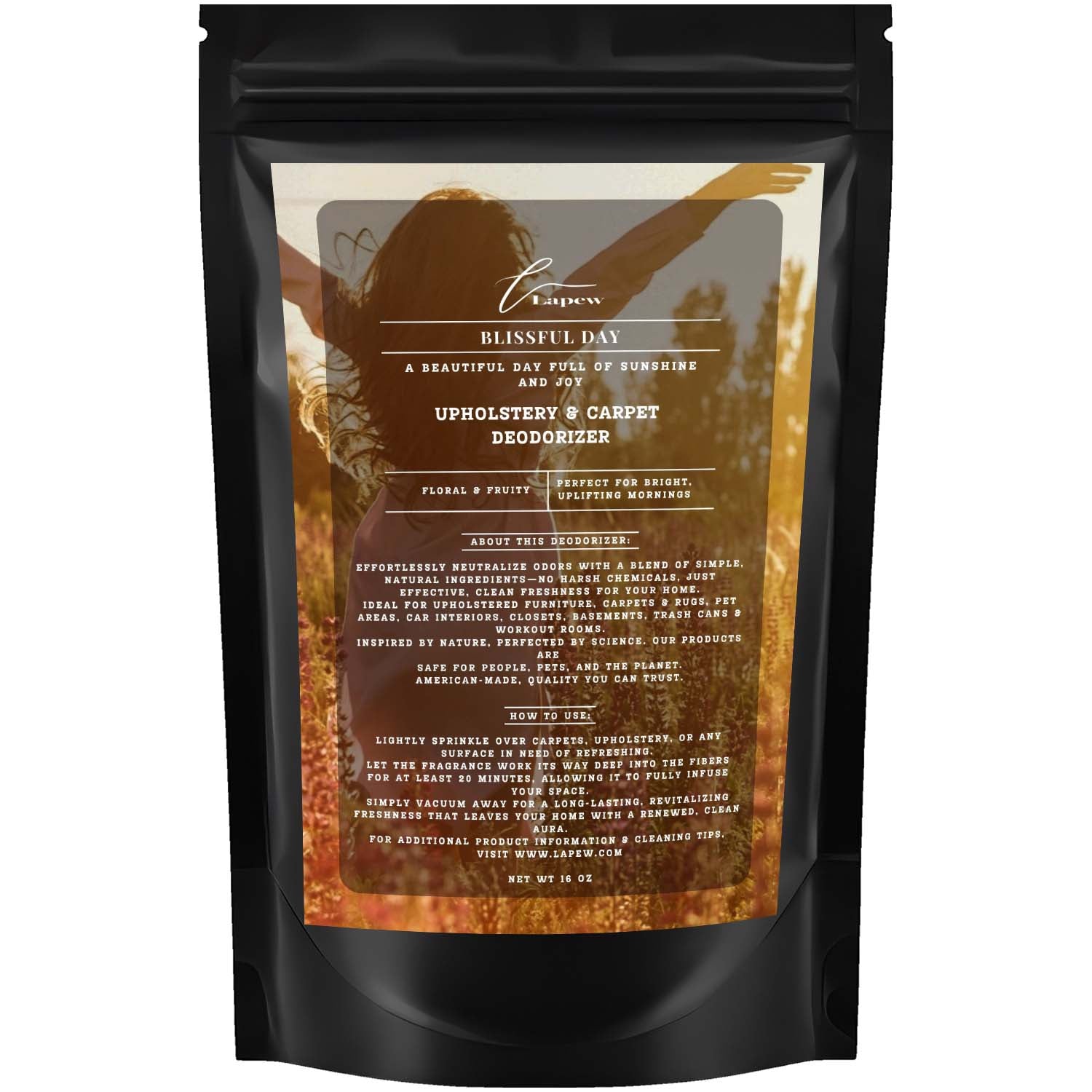 Lightly sprinkle over carpets, upholstery, or any surface in need of refreshing.