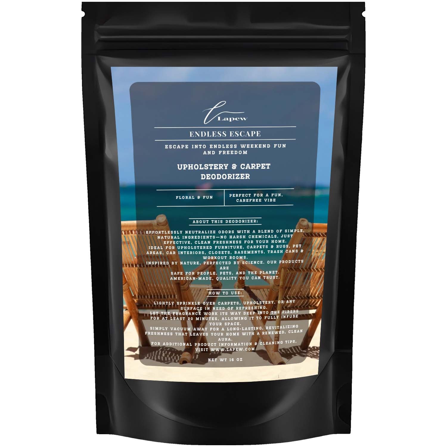 Lightly sprinkle over carpets, upholstery, or any surface in need of refreshing.
