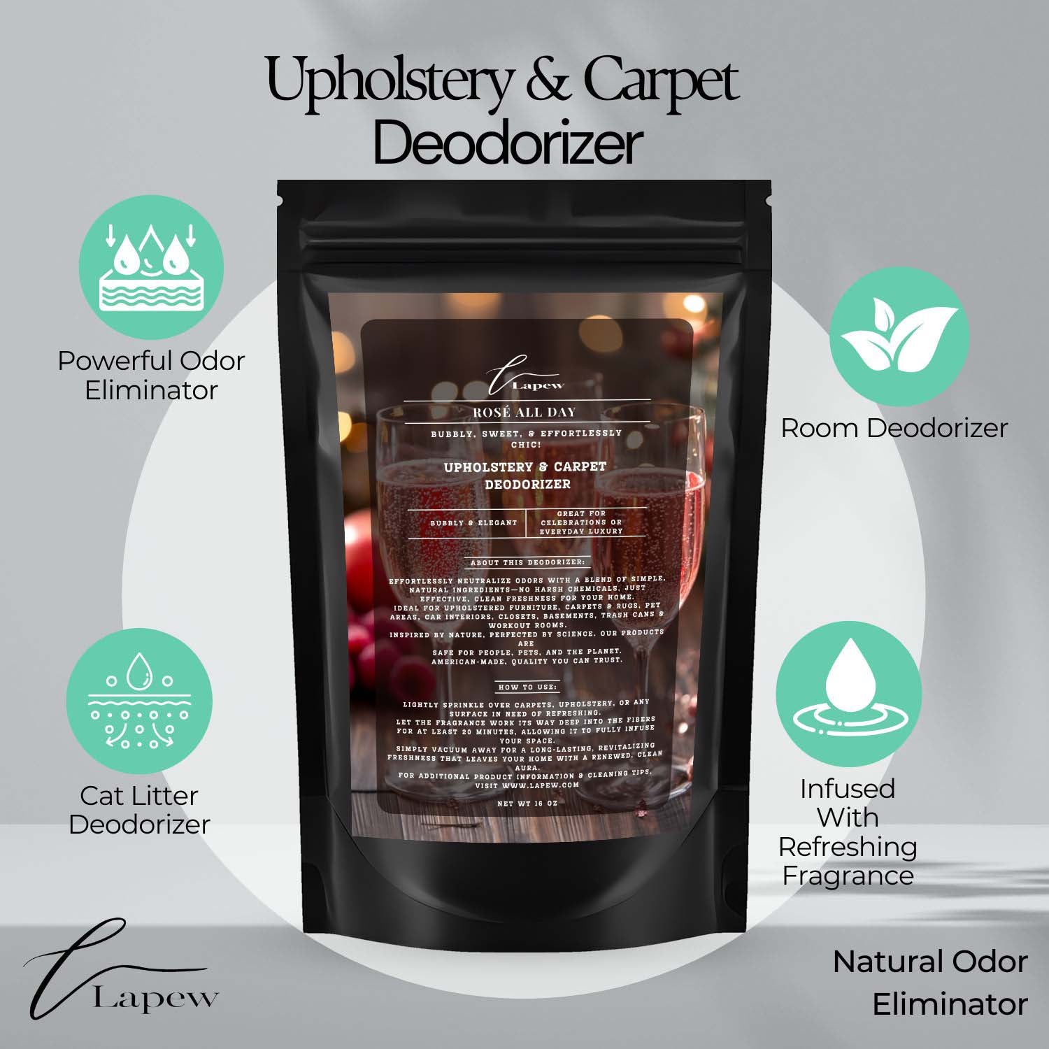 Lightly sprinkle over carpets, upholstery, or any surface in need of refreshing.